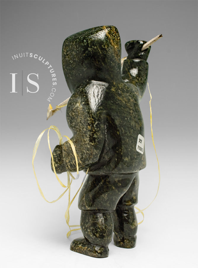 Our stoic Inuk stands quietly and motionless with his harpoon raised over his head (rope attached).