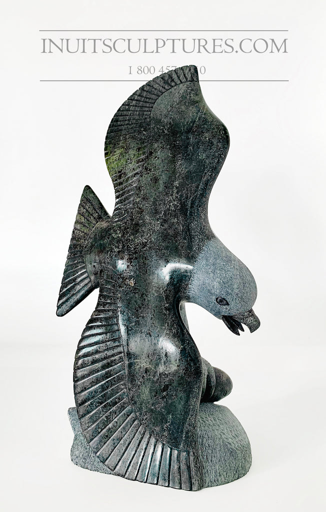 This sculpture is an one of Pits’ most desired pieces. Eagle with fish is presented by Canada’s most recognized Inuit artist, Pitseolak (Pits) Qimirpik from Kimmirut. Pits is among three elite Inuit artists in Canada who have won international status. His carvings are found in Canada’s national art collection in Ottawa and in exhibitions around the world.