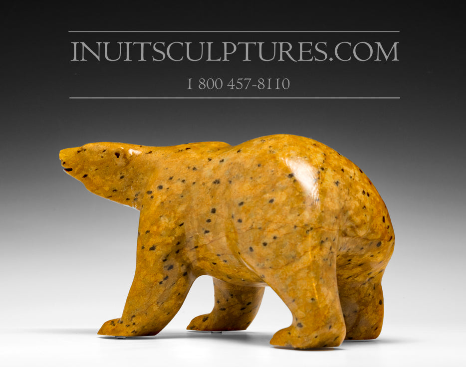 Nasogaluak’s Walking Bear is perfection. The stone is exquisite and pure with no veins, incursions or flaws. The finish of the Brazilian stone is smooth and delicious. The curves and posture of this bear are complex. He carries the weight of his substantial body on three legs. His fourth leg is frozen in time with only the toes still earthbound.