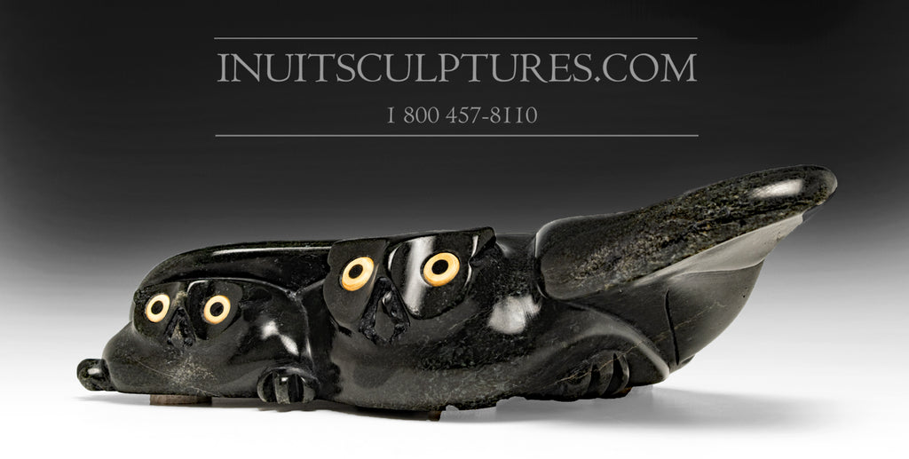 The eyes made from caribou antler blend exquisitely with the dark serpentine stone. The carving is polished to a mirror shine with beautiful proportions and lines throughout.