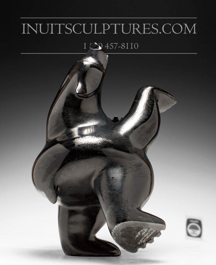 Like a magic powder, the riveting dark stone has reduced the subject to a graceful, cold somnambulisme not often seen in Inuit art. The exquisite black stone, beautiful lines and subtle curvatures elevate this sculpture to euphoric levels.