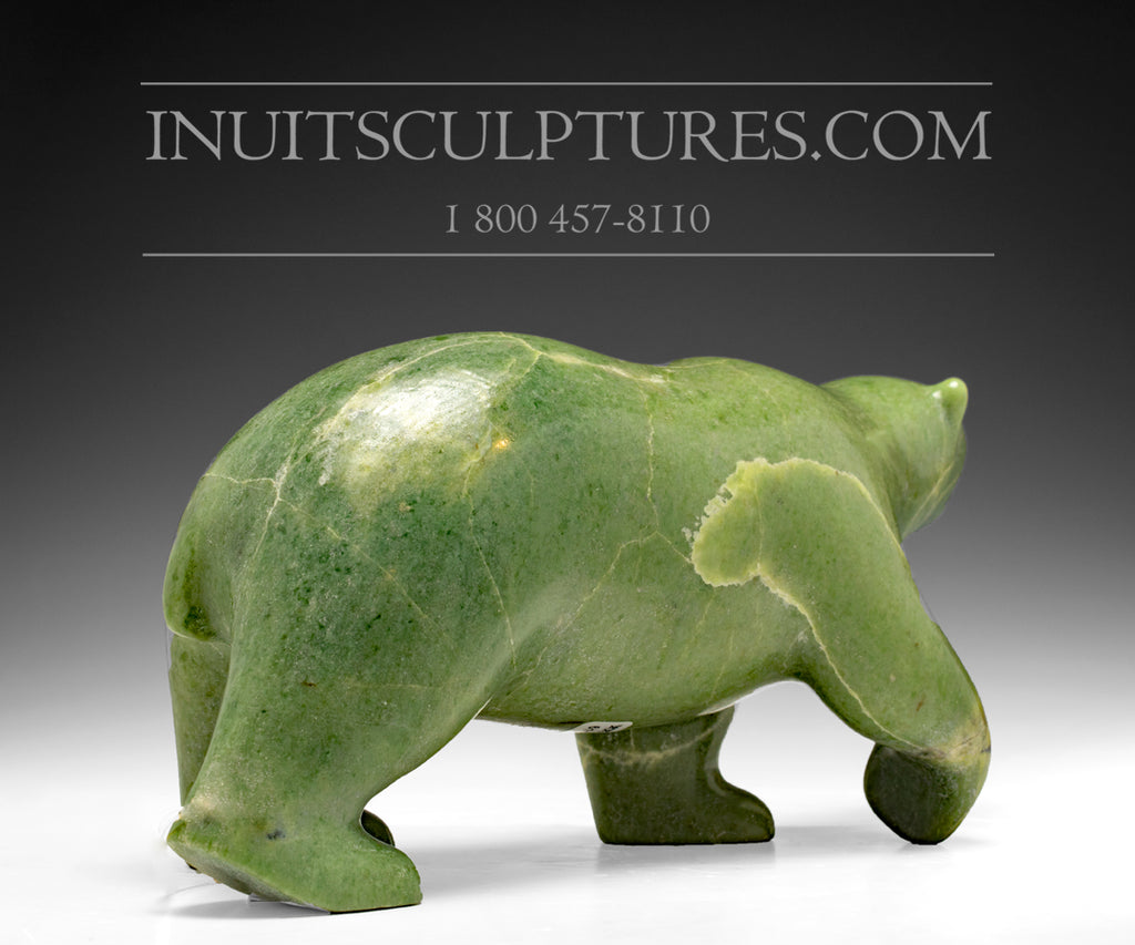 The bear is in motion.  The left front paw is being pulled up as the bear is preparing to place it on the ground while the left back ankle is extended as the animal walks forward.  You can feel this animal moving. This sculpture is in perfect balance with only two limbs planted firmly on the ground. This ability to create perfect balance requires the skill of a master carver like Nuna.
