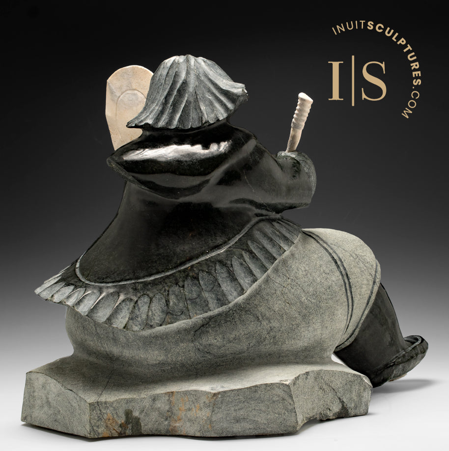 Jaco's large sculptures of Inuk people involved in traditional roles, are unprecedented in Inuit carving today. There are only a few artists (eg Abraham Anghik Ruben) who can create fantasy, myth, history and tradition from a piece of stone like Jaco Ishulutak.