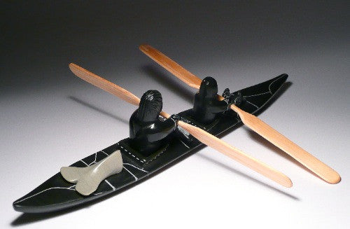 This beautiful Kayak measures 11"  long, 2.5" high, and 8.5" wide (paddles included).  The kayak is made from two different materials which blend very nicely together. The carving is from black argillite stone. The paddles are made from wood. Having this combination really makes the carving stand out. There is also beautiful detail in the Inuit faces. You will also notice three animals which were hunted. The goose and seal are very nicely detailed and add depth to the piece.
