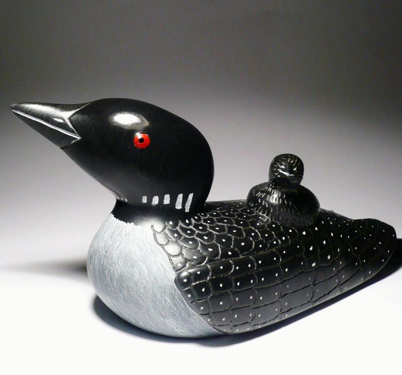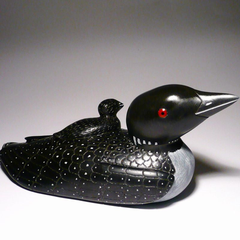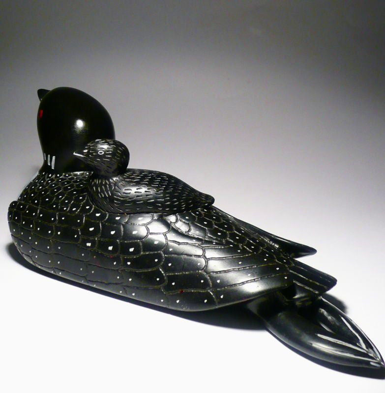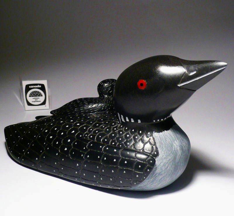 This is another completely outstanding original mother loon and her baby by world famous Inuit artist Jimmy Iqaluq from Sanikiluaq. It is a museum quality piece, and is worth three / four times the price when jimmy stops carving. This beautiful Loon measures 11.5 inches long by 4 inches tall, and 4 inches wide. The baby on the back is 2" long