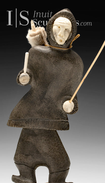 This sculpture by Moses Kamookak is a beautiful rendering of an Inuk man who is carrying a large spear for fishing.