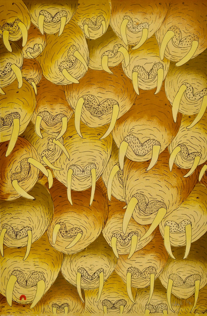 Walruses are one of the four printed lithographs by Shuvinai Ashoona released in spring 2018 special collection. The other three are Seals, Clams and Octopuses.