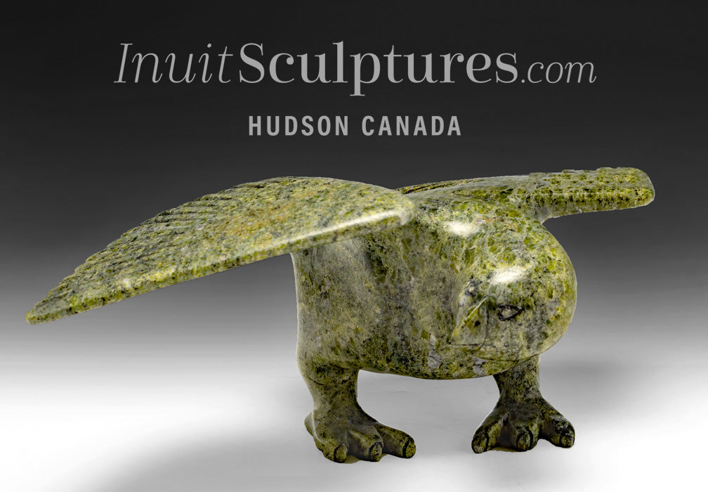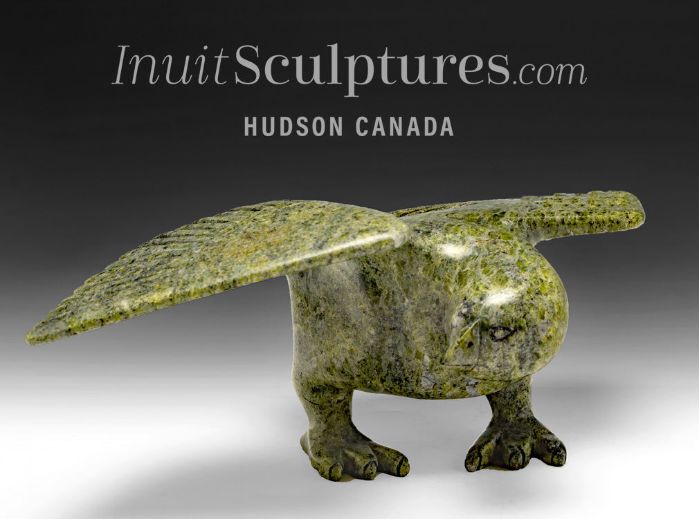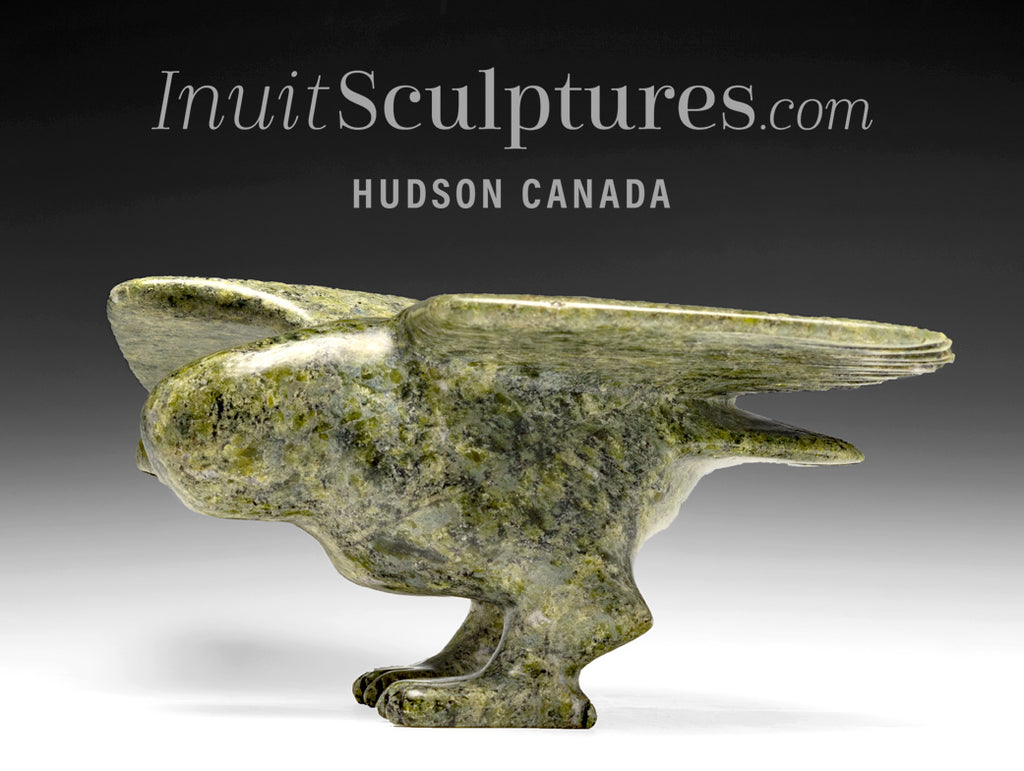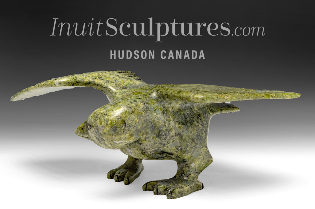 Killiktee has taken all his knowledge of the hawk and transformed it into this stunning carving. The neon apple green colour stone dappled with yellow and black is magnificent.