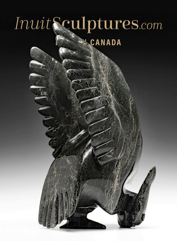 This Hawk is perfect.ly carved from the most gorgeous dark tones of serpentine stone. The wings are vertical and proud. Killiktee has emphasized the feathers along the edges of the wings creating depth and meticulous attention to detail.