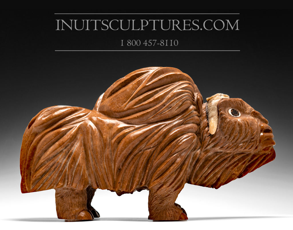 Provenance June 2019 - Damien only carves 2 -3 muskox like this a year. He uses a 40,000 year old mammoth tooth (a prehistoric animal) for the eyes. The muskox is draped in a beautiful copper brown dolomite stone. Damien is a master of mixed media.