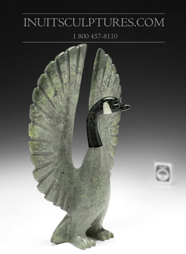 This is an outstanding proud standing Canada goose from Cape Dorset directly from Johnysa Mathewsie. What is so special about this carving is that the proportions are exceptional and the detail and lines are as crisp as you will ever see in a perfectly made sculpture.