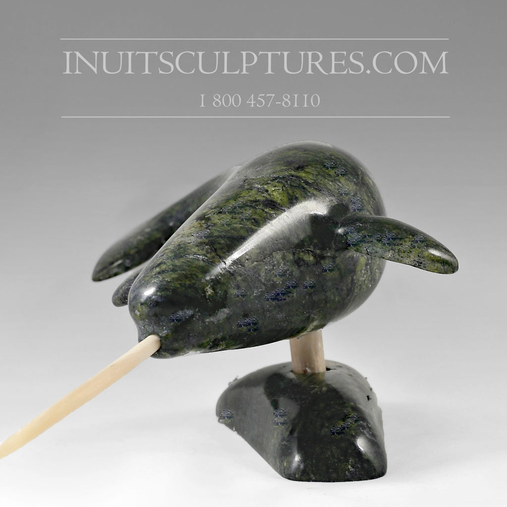 This is a beautiful rendition of a swimming Narwhal by Louis Uttaq. Powerful creatures of the Arctic sea, this piece is elevated on an antler allowing the viewer to observe his power and might as it speeds through the water like lightening.