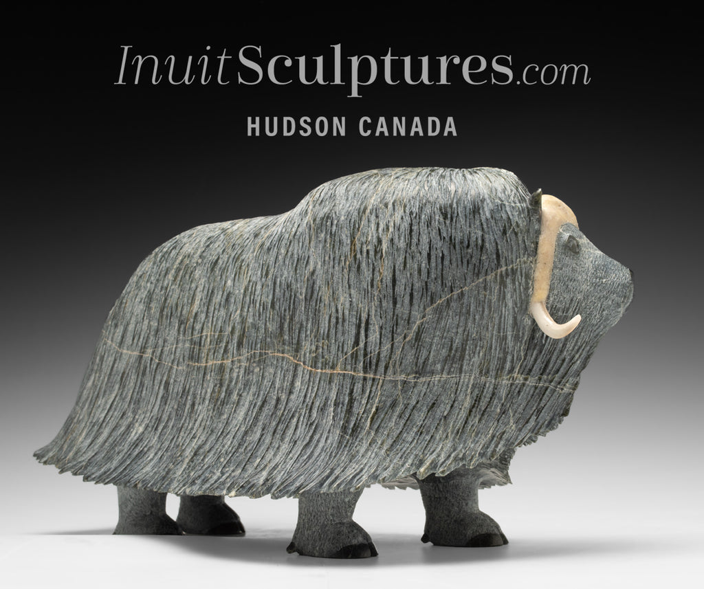 ** Lucassie carves only a few Muskox carvings per year. Carving stone causes many chronic health problems like chronic lung disease, severe arthritis, and chronic rotator cuff tears. It is not surprising that our senior Carvers become less able to carve as the years go by. Lucassie's Muskox sculptures are internationally recognized as his signature carvings.