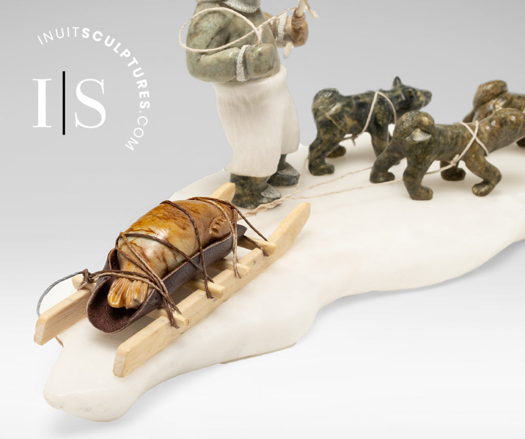 The star feature of this Peter K.hunting scene has to be the large seal which is tightly bound to the sled in preparation for the long trip home.