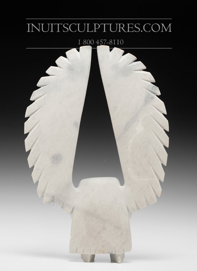 Everything about this piece is perfect. From the gorgeous off white stone to the captivating eyes made with caribou antler. The two elements together contrast exquisitely making this a very dynamic piece.