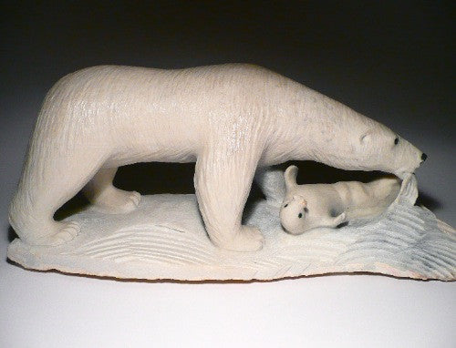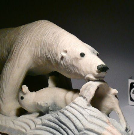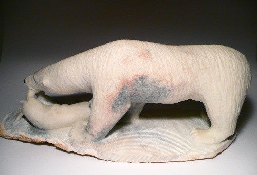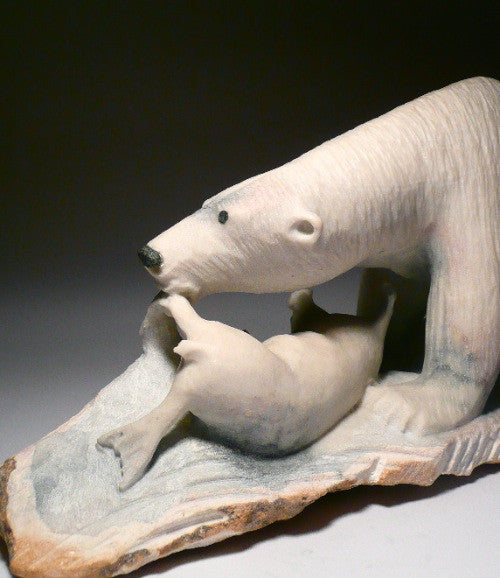 Simon Qammaniq makes beautiful carvings set in their natural environments. This bear is extremely beautiful.  The electrifying white stone makes a stunning impression. The proportions are absolutely perfect. I noticed this carving right away when I saw it.