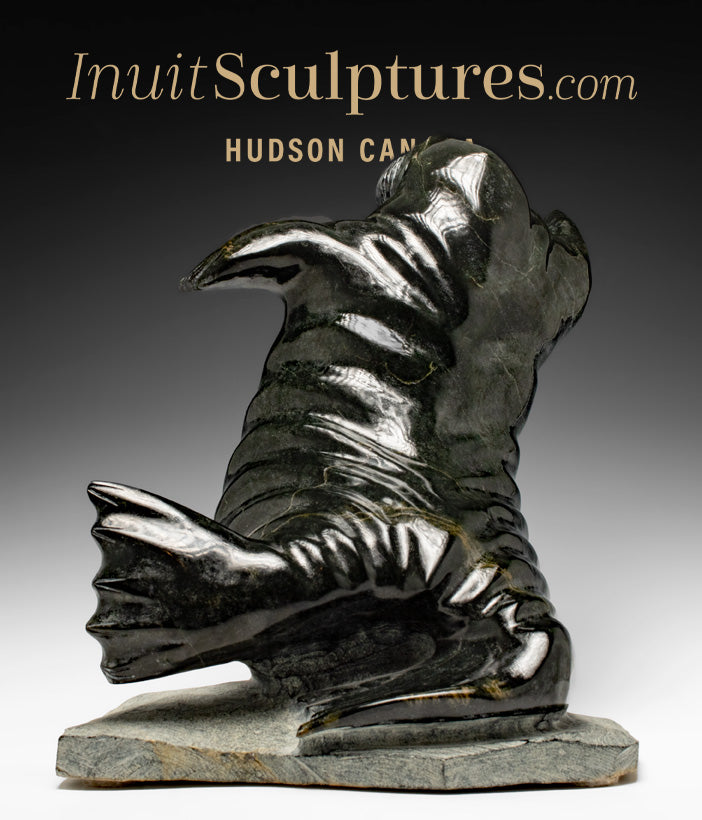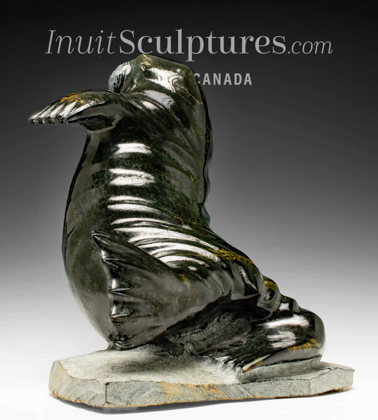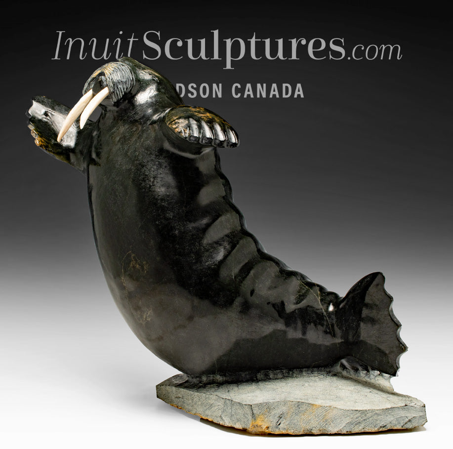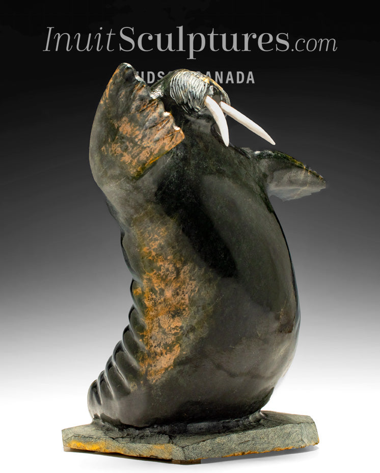 World renowned carver Jimmy Iqaluq loves to use a deep medium green colour stone for his rippled walruses. He also likes to create a deep red coloured eye for his carvings.