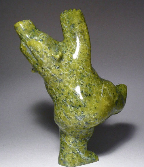 What attracts me most about this bear is the vibrant and electrifying apple green colored stone Moe uses to carve with. The color alone sends very positive and happy vibes around the room and really makes this dancing bear stand out. Also, the movement and gorgeous shiny polish for this bear is beautiful and really make it come life.