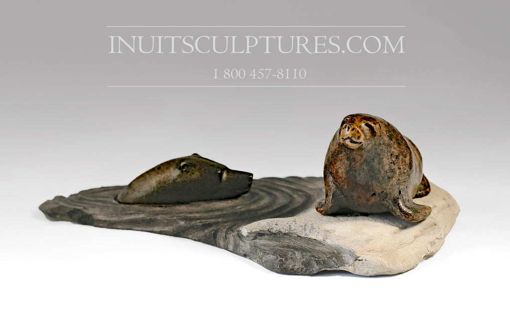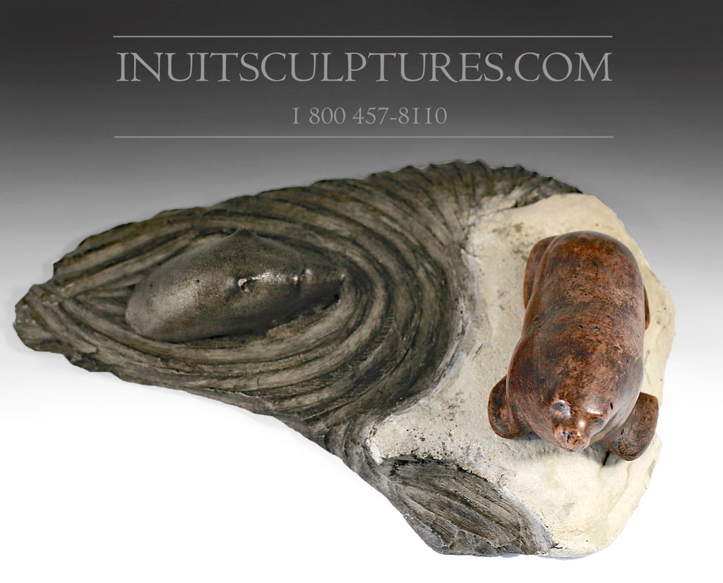 The craftsmanship of this bear and seal are absolutely divine. As a curator of the gallery, I am particularly drawn to carvings that are made from mixed media. This one in particular is made from two different stones that contrast splendidly together.