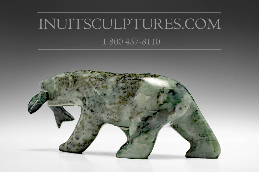 This is a gorgeous carving depicting a bear in its natural habitat. This bear is gracefully carved in the actions of catching a salmon fish. This is a very rare find and Sheutiapik is the only artist who carves this subject as it is hard to carve both a bear and fish together.