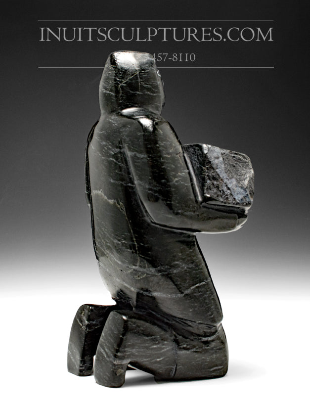 Eskimo Carver is a first of its kind piece in that it depicts an eskimo boy holding a stone to carve with. Like most of Pit's pieces, this carving is very iconic in that it captures the essence of a carvers life in the North.