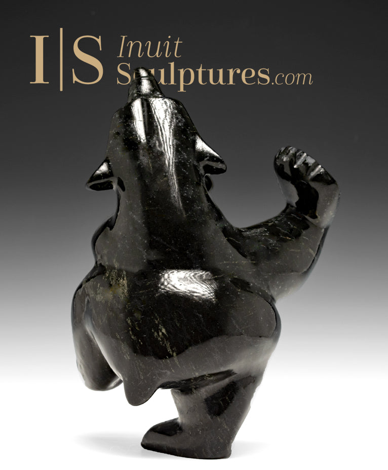 He is carved in the realistic style. His body is ample and muscular. Ottokie has given him a humourous demeanour. He is a Cape Dorset bear for sure as the Cape Dorset aesthetic is realism combined with humour and dancing!