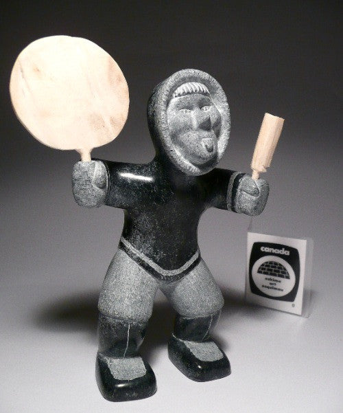 This is a beautiful composition piece of an Inuit  drum dancer. The stone has vivid grey textures that give it a sleek, mature and sophisticated look and feel. The proportions are wonderfully crafted, and lines are well contoured. This is a perfect depiction of Inuit life and culture.