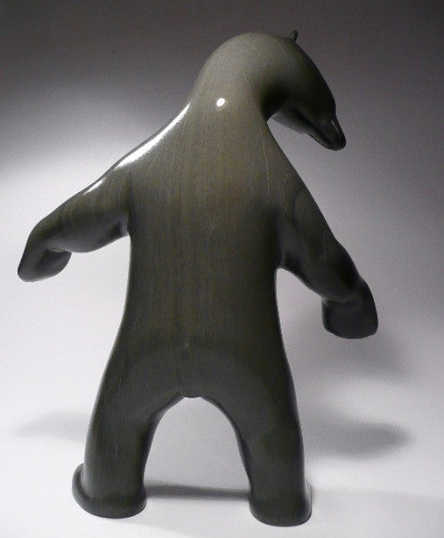 This graceful bear is one of the nicest dancing bears I have ever seen. The arms and hands have a fluid flow to them that give it an unparalleled grace like never seen before in a carving. It has a beautiful refined finish to it. The argillite stone has a beautiful dark smooth texture consisting of beautiful wavy grains sweeping against the stone. The proportions are superbly done and the subject is very harmonistic in nature. This carving resonates joy and happiness as well as a pinch of sophistication.