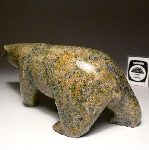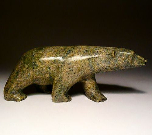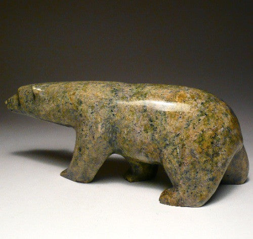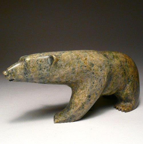 Noo Atsiaq was born in Iqaluit (Frobisher Bay), Nunavut and now lives and carves in Cape Dorset, the capital of Inuit art. His Parents are Alashua Atsiaq and Piulia Pudlalik Atsiaq. Noo has been carving since he was a young kid. He was initially taught by watching other carvers. His favorite subject is bears, dancing, diving and walking. Sculptures by Noo Atsiaq are well known and thought after in the Inuit art collectors world. He also occasionally carves people and caribou.