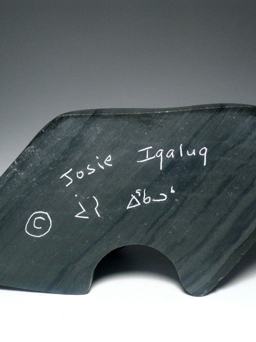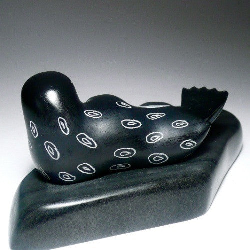 What caught my eye with this piece is the jet black stone used. I also particularly like the heads of the two seals as well as the etching mark spots on the back. Josie Iqaluq's is well known for his playful fun loving seals. They make wonderful gifts for weddings or anniversaries as they convey peace and harmony. It is very symmetrical and round with a gorgeous smooth finish to it. A property amongst Sanikiluaq art which makes it so famous.